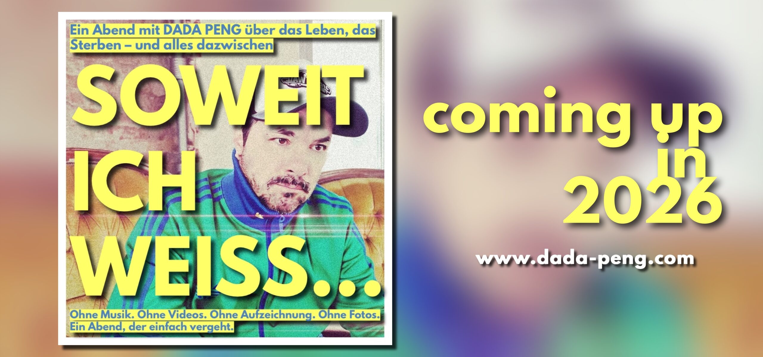 Zum 25-jährigen Jubiläum seiner Arbeit lädt der Autor, Musiker und Initiator der preisgekrönten Initiative Superhelden fliegen vor zu einem besonderen Abend ein: Soweit ich weiß ist keine Show, kein klassischer Vortrag. Es ist eine Begegnung. Eine Stunde Echtheit. Ohne Musik. Ohne Video. Ohne Ablenkung. Und ganz bewusst: ohne Aufzeichnungen, ohne Fotos, ohne Handys. Nur DADA PENG und das Publikum – im Moment.